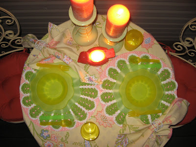 Adorable bistro table! Love the candlesticks with the peachy candles.